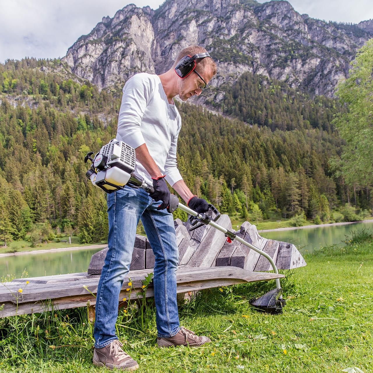 Der Fadenkopf mit einer Schnittbreite von 41 cm und das geringe Gewicht von nur 5,0 kg und die einfache Handhabung mit ergonomischem Softgriff gewährleisten ein effizientes Arbeiten und schnelle Mähergebnisse in der Fläche sowie an Zäunen und Mauern. Per Tipp-Automatik stellen Sie die optimale Fadenlänge während des Mähens leicht ein, indem Sie einfach mit dem Trimmerkopf auf den Boden tippen.